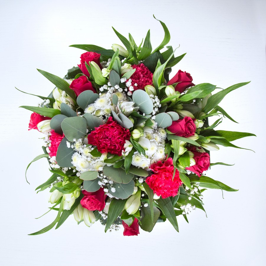Our Elegant Serenity Bouquet is a masterpiece of floral artistry, combining white chrysanthemums and gypsophila with the vibrant tones of red roses and carnations. The addition of white alstroemeria and lush aspidistra leaves creates a harmonious and visually stunning arrangement.